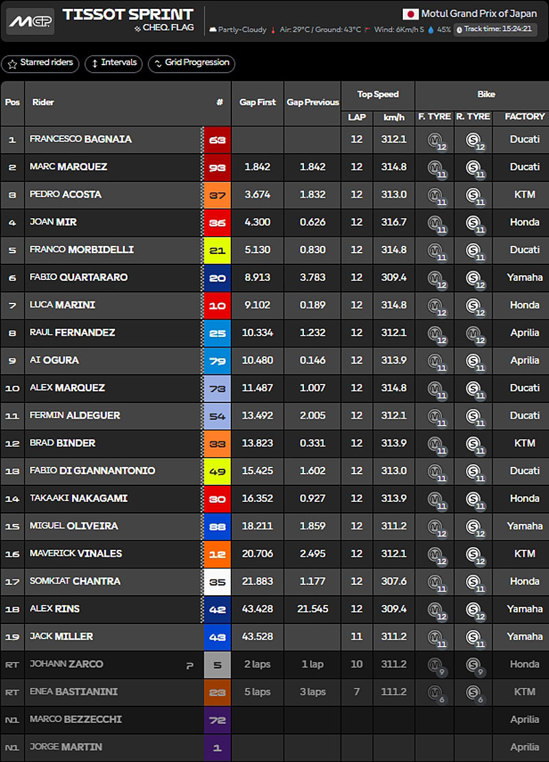 Grâce à une fourche et un bras oscillant de l’année précédente, le double champion du monde 2022-2023 s’est en effet imposé au terme des 12 tours disputés sur le tracé nippon, en s’échappant immédiatement et en construisant un écart croissant au fil de la course : une véritable métamorphose qui fait plaisir, après le triste spectacle donné à de trop nombreuses reprises ces derniers temps.