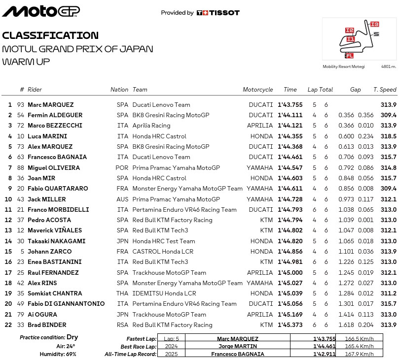 Ce matin, durant le warm up, Marc Marquez a clairement repris la main en étant le seul à tourner en 1’43, devant Fermin Aldeguer et Marco Bezzecchi.