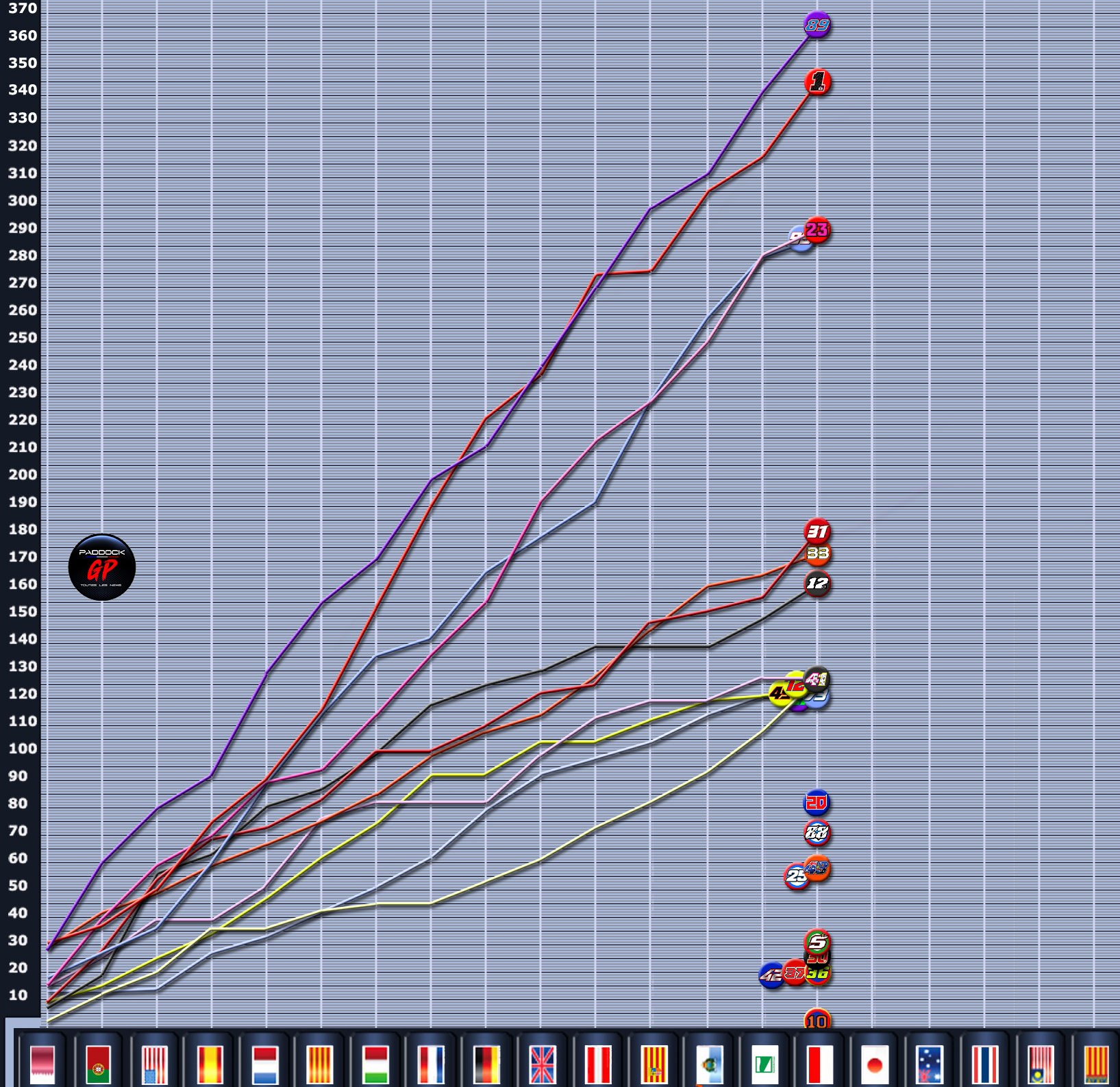 Plus qu’un simple tableau Excel, notre graphique permet de voir immédiatement les faits marquants de la saison en cours, avec en particulier l’échappée de Jorge Martin (Prima Pramac Racing) et Francesco Bagnaia (Ducati Lenovo Team), frères ennemis de la catégorie qui, peu à peu, se libèrent du duo composé de Marc Marquez (Gresini Racing MotoGP™) et Enea Bastianini (Ducati Lenovo Team).