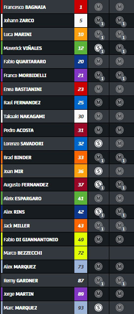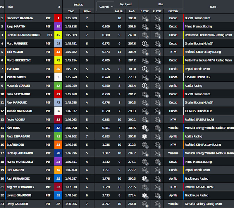 La hiérarchie est alors composée de Francesco Bagnaia, Jorge Martin, Fabio Di Giannantonio, Marc Márquez, Jack Miller, Marco Bezzecchi, Joan Mir, Johann Zarco, Maverick Vinales, Enea Bastianini, Alex Márquez, Takaaki Nakagami, Pedro Acosta, Aleix Rins, Aleix Espargaro, Brad Binder, Fabio Quartararo, Franco Morbidelli, Luca Marini, Raul Fernandez, Augusto Fernandez, Lorenzo Savadori et Remy Gardner.