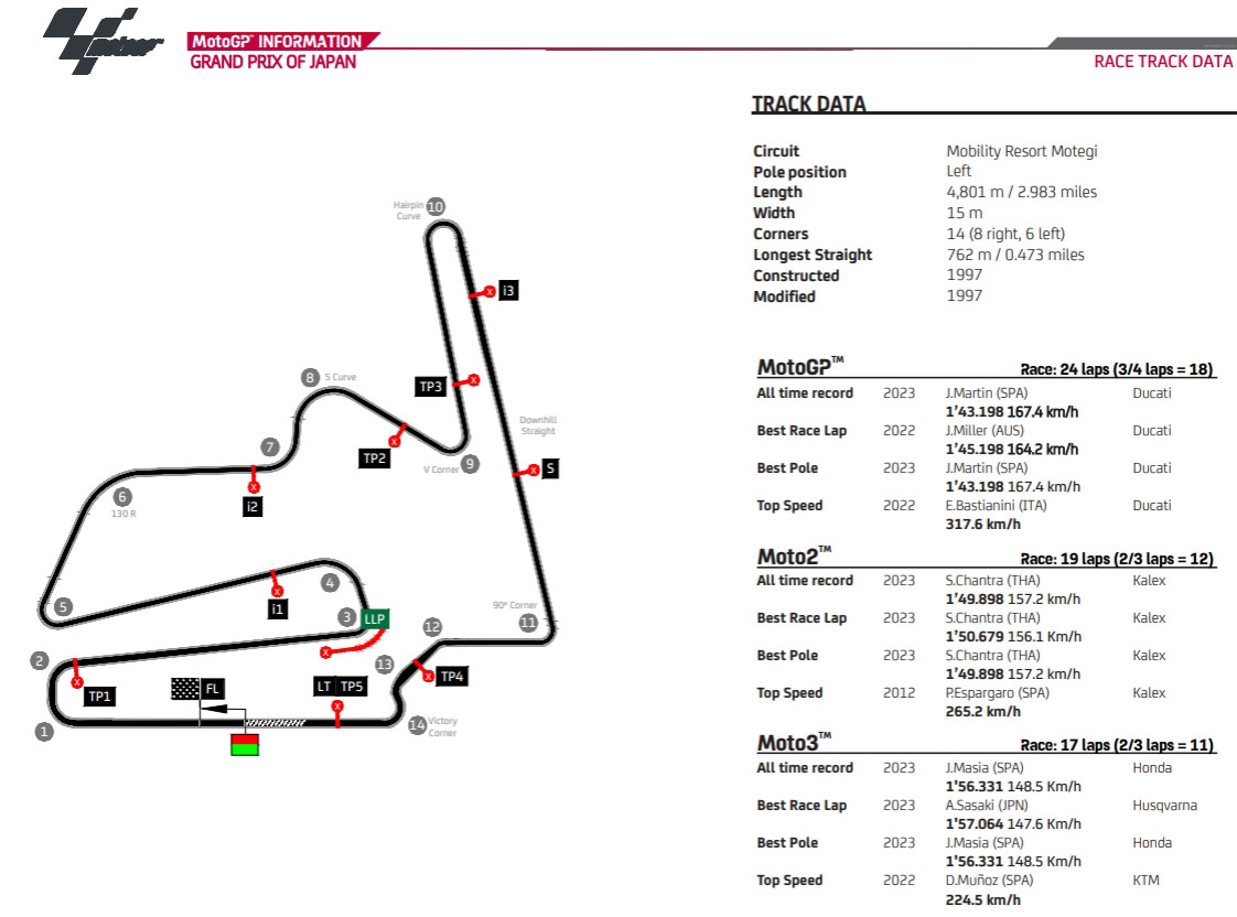 En conséquence, les freinages sont très sollicitant et Brembo affiche un indice de difficulté de 6 sur 6 pour la tracé nippon, avec en particulier les virages 1, 5, 10 et 11 mettant le plus à l’épreuve les systèmes de freinages. Comme chaque année, les disques carbone ventilés sont obligatoires, en 340 ou 355 mm, tout comme à Spielberg (Austriche) et Buriram (Thaïlande).