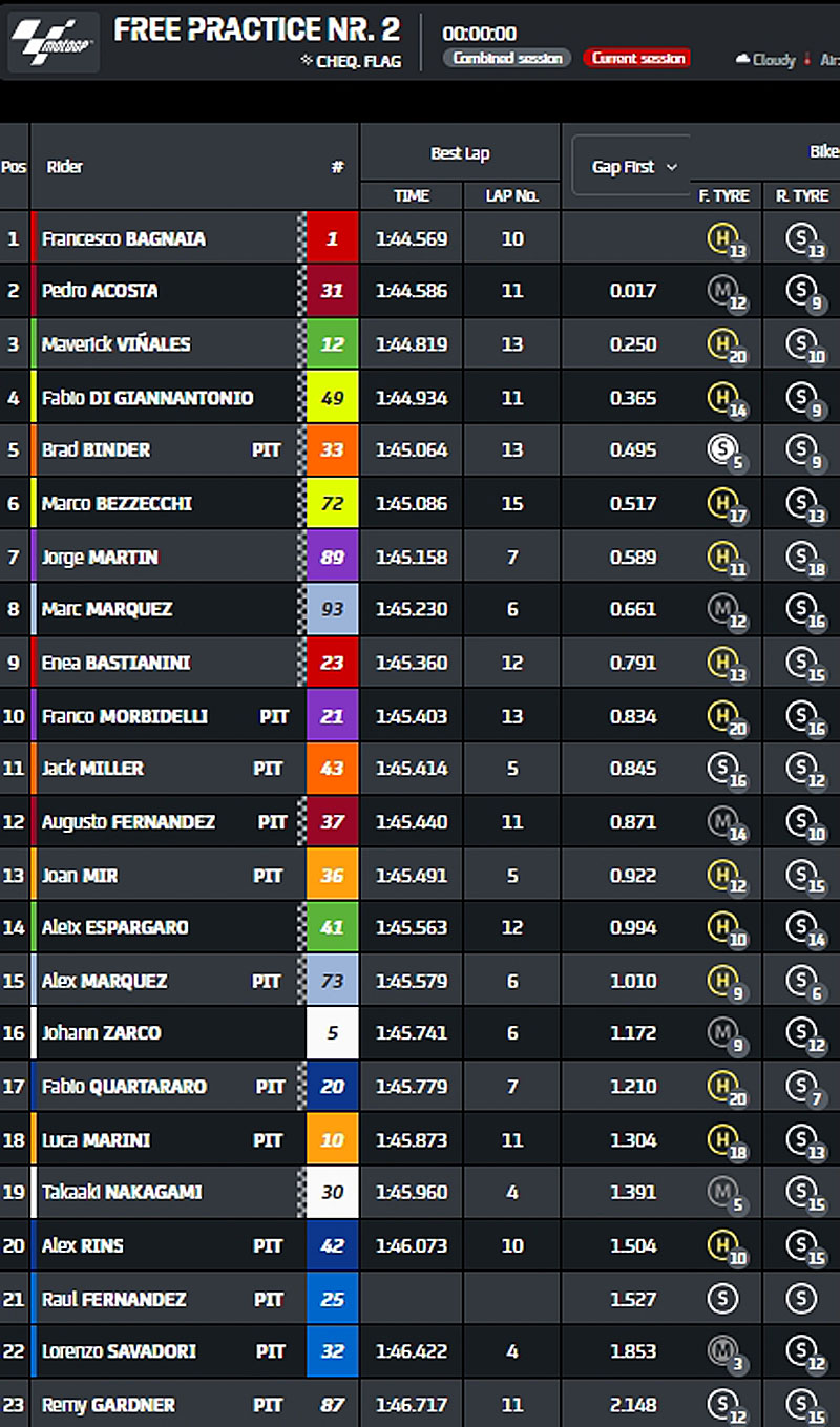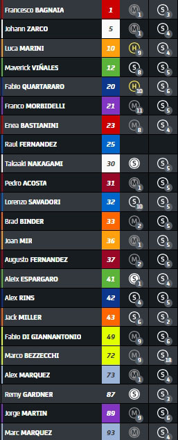 À cet instant, la hiérarchie est composée de Jorge Martin, Marc Márquez, Pedro Acosta, Jack Miller, Joan Mir, Francesco Bagnaia, Alex Márquez, Brad Binder, Aleix Espargaro, Franco Morbidelli, Johann Zarco, Fabio Quartararo, Augusto Fernandez, Fabio Di Giannantonio, Luca Marini, Takaaki Nakagami, Enea Bastianini, Aleix Rins, Raul Fernandez, Lorenzo Savadori, Maverick Vinales, Marco Bezzecchi et Remy Gardner.