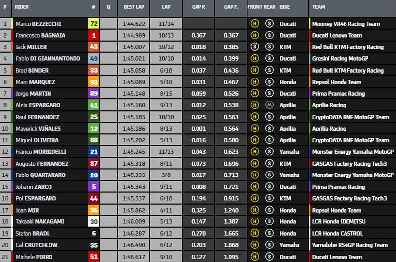 On assiste alors à une charge italienne avec Marco Bezzecchi en 1’45.048 devant Francesco Bagnaia, les deux hommes précédant Marc Márquez Fabio Quartararo et Fabio Di Giannantonio.
