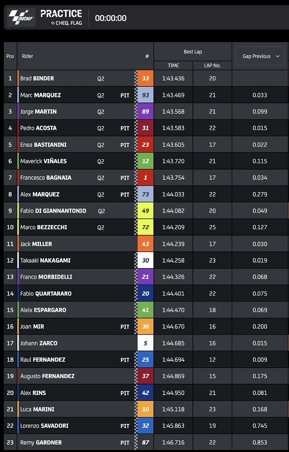 Résultat de la Practice au Grand Prix du Japon MotoGP 2024 :