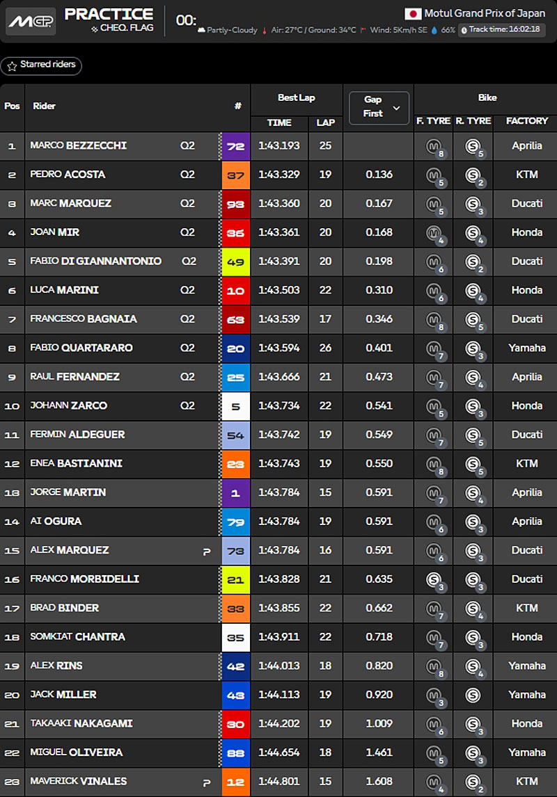Résultat de la Practice au Grand Prix du Japon MotoGP 2025 :