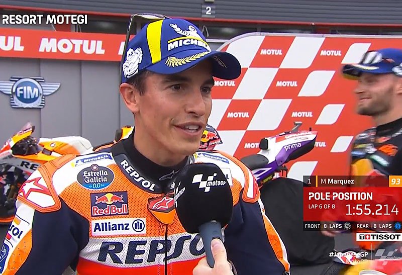 A peine descendu de sa Honda RC213V officielle après avoir obtenu la pole position du Grand Prix du Japon MotoGP sur le circuit de Motegi, comme il l’avait fait en 2019 pour la dernière fois de sa carrière, Marc Márquez s’est confié devant les caméras du site officiel MotoGP.com avec la satisfaction d’avoir tiré le meilleur parti de l’adhérence élevée de la piste japonaise sur le mouillé… devant son patron !