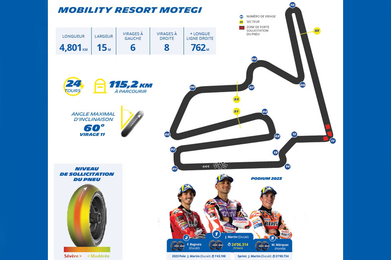 « Comme les nombreux fans qui nous rendent visite ici au Japon, nous sommes heureux de retourner à Motegi. » indique Piero Taramasso, manager de la compétition deux-roues de Michelin. « C’est un tracé très varié et exigeant. Il demande beaucoup au pneu arrière car les relances sont nombreuses et il faut passer la puissance au sol, mais aussi au pneu avant car les freinages violents se répètent. C’est un circuit que nous qualifions de « stop and go », avec des changements de rythme nombreux qui mettent nos pneus sous contrainte. La structure de nos pneus a bien sûr été étudiée pour apporter toute la stabilité nécessaire, et permettre aux différentes gommes de faire leur travail aussi bien en termes de motricité que de constance dans l’effort. C’est un circuit où les virages s’enchainent et où les transferts de masse doivent s’opérer avec une grande confiance. La polyvalence de nos gommes, tout comme la maitrise des phénomènes thermiques, que nous avons travaillés lors de la mise au point de mélanges 2024, devraient donner satisfaction à chacun de nos partenaires. Nous avons fait une sélection des gommes pertinente au regard des conditions attendues, y compris en cas de pluie, sur la base des datas emmagasinées depuis des années à Motegi, mais aussi en fonction de l’augmentation des performances des motos. »