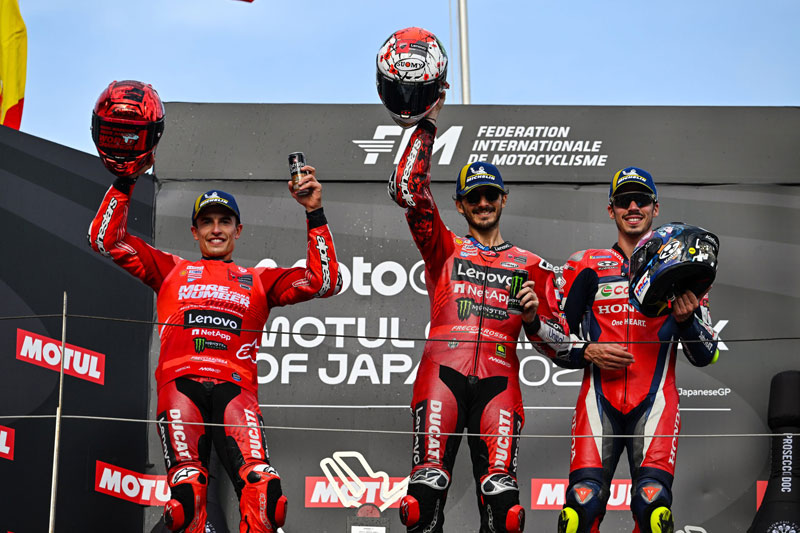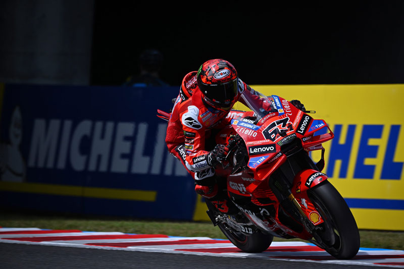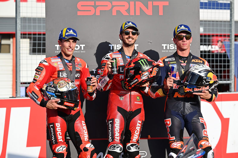 Samedi après-midi Francesco Bagnaia a remporté la Tissot Sprint, devant son coéquipier Marc Márquez et Pedro Acosta (Red Bull KTM Factory Racing)