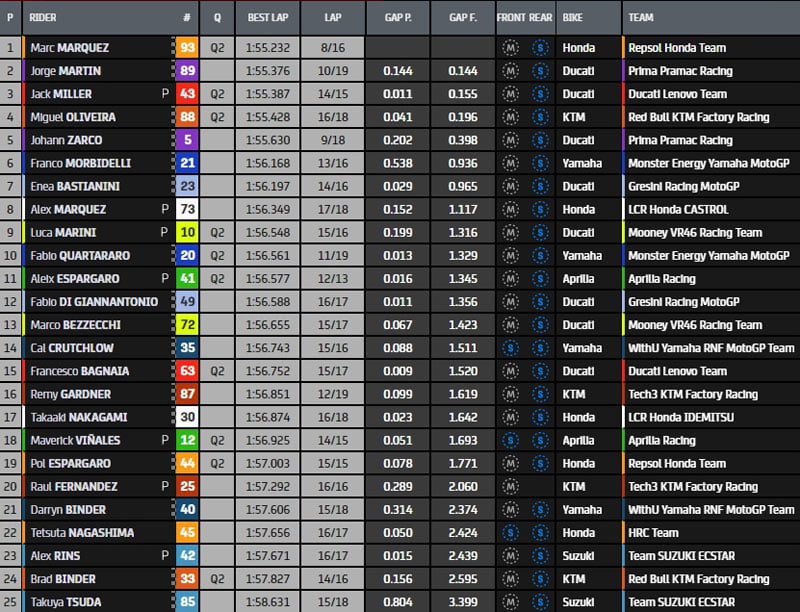 Jorge Martin fait briller les couleurs Pramac en 1’56.672, Enea Bastianini celles du team Gresini en 1’56.446, Miguel Oliveira celles de KTM Factory en 1’56.313, puis Marc Márquez frappe à nouveau un grand coup en 1’55.232 !