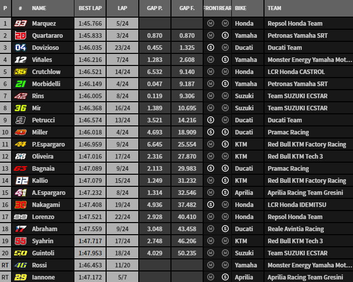 Une performance qu’il a fallu aller chercher. Car vendredi, Miguel Oliveira a violemment chuté. Ce qui n’a pas arrangé son niveau de forme. Mais le pilote Tech3 est dur au mal. Sur sa prestation, il a commenté sobrement : « ce n’était pas une course parfaite, mais ce n’était pas la pire. Je pense avoir bien fini la course, le rythme était plutôt bon et compétitif. Seul le début était terrible, je ne pouvais attaquer dans les premiers virages et j’ai perdu beaucoup de places. Mais quand j’ai eu un peu plus d’espace, j’ai pu me battre pour les points. Et c’était le but. »