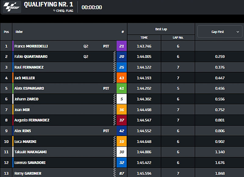 Malheureusement, nos représentants, Fabio Quartararo (Monster Energy Yamaha MotoGP) 14e et Johann Zarco (Castrol Honda LCR) 17e, ne figurent pas dans un top 10 complété par Alex Marquez (Gresini Racing MotoGP™), Fabio di Giannantonio (Pertamina Enduro VR46 Racing Team) et Marco Bezzecchi (Pertamina Enduro VR46 Racing Team).