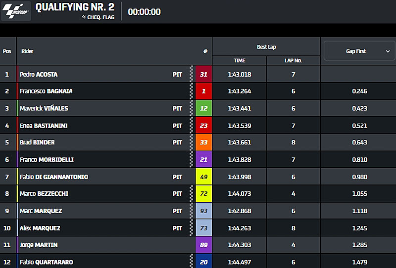 C’est alors qu’un message officiel annonce que le temps de Marc Márquez est annulé, pour avoir « excédé les limites de la piste » au virage #4. On n’a pas fini d’en entendre parler et c’est donc Pedro Acosta qui hérite du nouveau record du circuit…