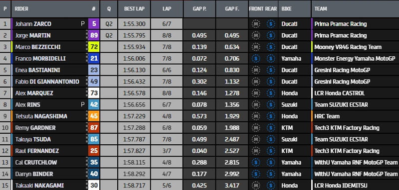 Johann Zarco domine la Q1 en 1’55.300 devant Martin repoussé à près d’une demi-seconde. Bezzecchi est le premier éliminé. Bastianini s’élancera seulement quinzième.