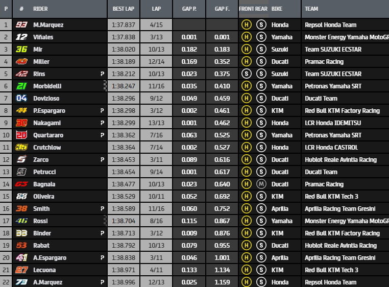 À la mi-séance, Marc Márquez et Maverick Viñales précèdent de plus de 4/10 Pol Espargaró, Andrea Dovizioso, Álex Rins, Fabio Quartararo, Cal Crutchlow, Joan Mir, Johann Zarco et Takaaki Nakagami.