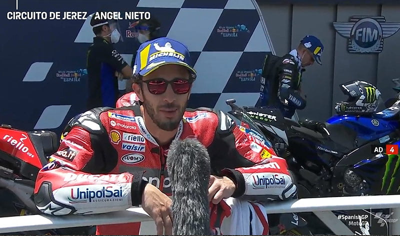 A peine descendu de sa Ducati GP20 officielle après avoir obtenu la troisième place du Grand Prix d’Espagne à Jerez, Andrea Dovizioso s’est confié devant la caméra du site officiel MotoGP.com avec l’immense joie d’avoir sauvé son week-end malgré des débuts en demi-teinte et sa fracture de la clavicule…