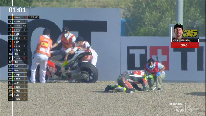 La séance de réchauffement n’a pas été bénéfique pour un Cal Crutchlow qui y a chuté. Il s’est relevé pour marcher accompagné des commissaires qui l’ont sorti de l’ère de jeu. Mais le team LCR annonce que l’Anglais est depuis parti à l’hôpital pour faire des examens.