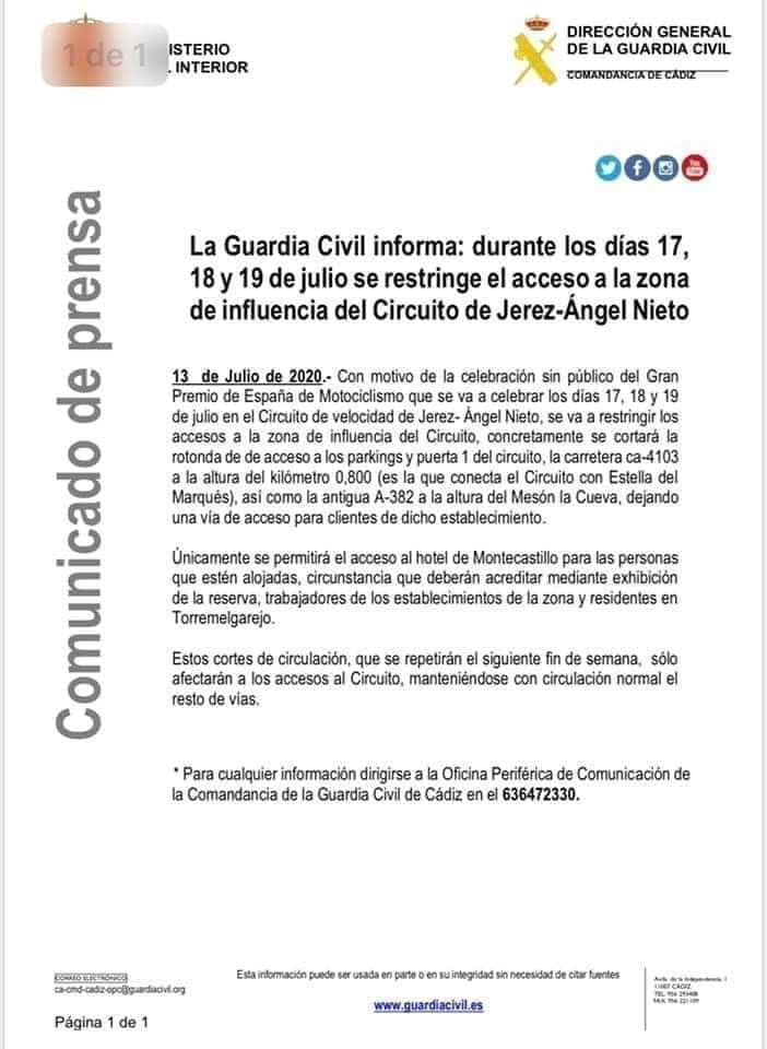 Pour ceux qui voudraient voir, malgré un huis-clos décidé, la Guardia Civil a annoncé qu’elle limiterait la circulation, de vendredi à dimanche, sur les routes d’accès au circuit Jerez-Ángel Nieto. Ces réductions de trafic n’affecteront que les accès au circuit de Jerez, le reste des itinéraires restant en circulation normale, selon un communiqué envoyé par l’Institution.