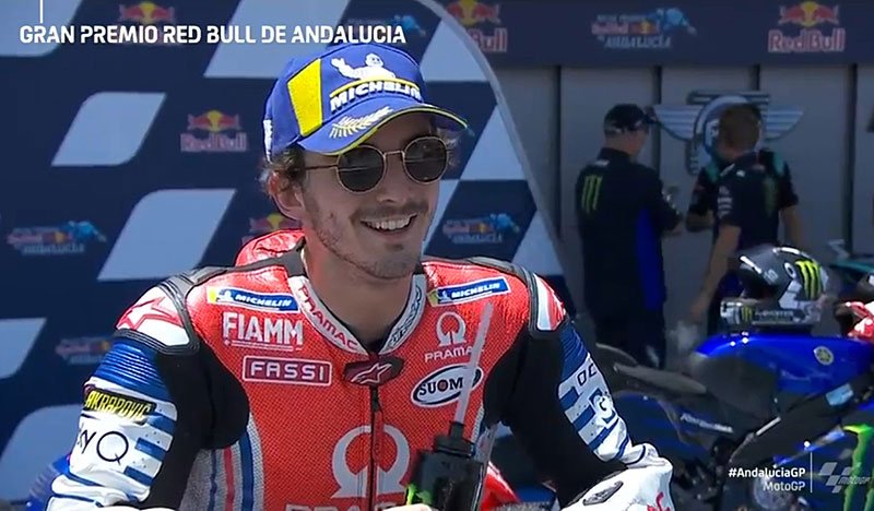 A peine descendu de sa Ducati GP20 du team Pramac Racing après avoir obtenu la troisième place sur la grille de départ du Grand Prix d’Andalousie à Jerez, Francesco Bagnaia s’est confié devant la caméra du site MotoGP.com avec la joie d’avoir obtenu sa première première ligne en MotoGP, même si le pilote italien pense qu’il aurait pu faire encore mieux…
