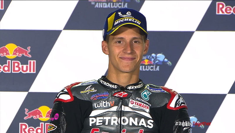 Via le site officiel MotoGP.com, nous avons assisté aujourd’hui à la conférence MotoGP post-course du Grand Prix d’Andalousie qui a réuni Fabio Quartararo, Maverick Viñales et Valentino Rossi.