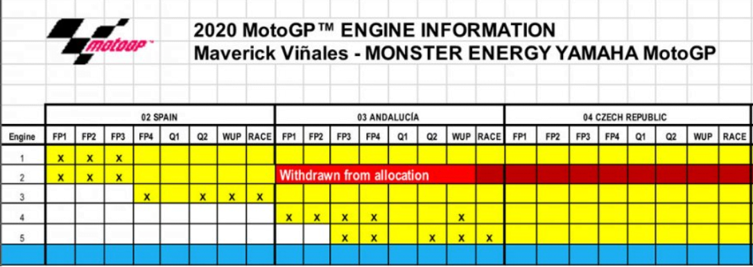 Ce matin, Dorna a fourni à la presse des tableaux qui résument l’utilisation des moteurs en MotoGP lors des deux premières courses de 2020. Alors que Ducati, Suzuki, Honda, KTM et Aprilia n’ont utilisé que deux moteurs par pilote chez Yamaha, il est surprenant de constater que les pilotes Yamaha ont déjà utilisé jusqu’à cinq moteurs en seulement deux week-ends.