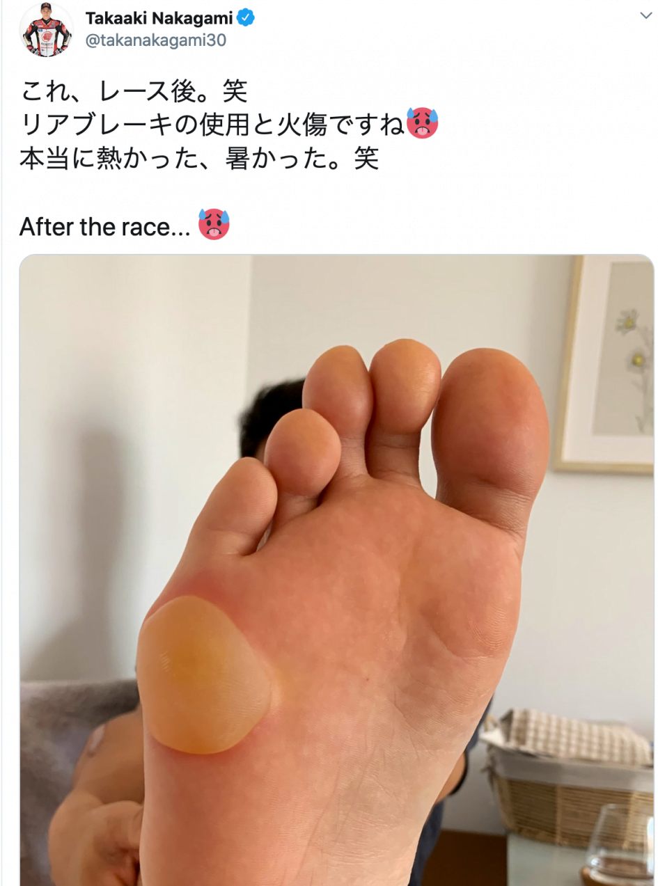 Une réalité, et non pas seulement une image, si l’on en croit par l’état du pied de Takaaki Nakagami. La cloque n’est pas anodine et montre à quel point les organismes ont été poussés à l’extrême lors de cette manche.