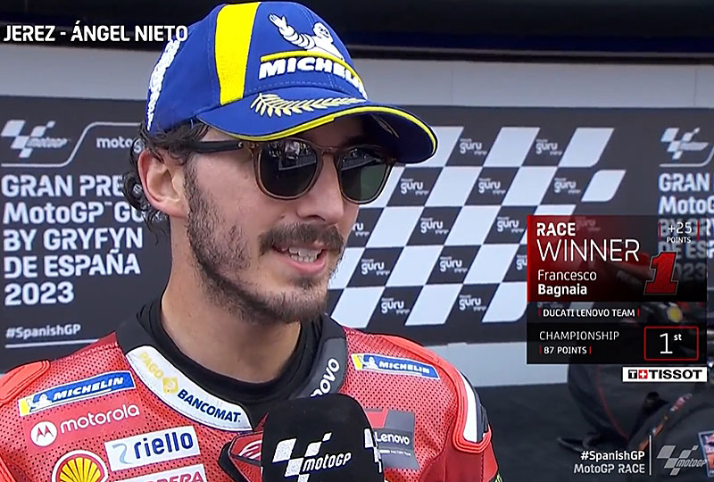A peine descendu de sa Ducati GP23 officielle après avoir remporté le Grand Prix MotoGP d’Espagne sur le circuit de Jerez, Francesco Bagnaia s’est confié devant les caméras du site officiel MotoGP.com avec la satisfaction d’avoir redressé la barre après ses chutes en Argentine et aux USA…