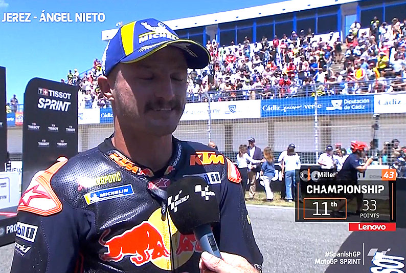 A peine descendu de sa KTM RC16 officielle après avoir terminé 3e du Sprint du Grand Prix MotoGP d’Espagne sur le circuit de Jerez, Jack Miller s’est confié devant les caméras du site officiel MotoGP.com avec la joie de retrouver un second souffle avec la KTM…