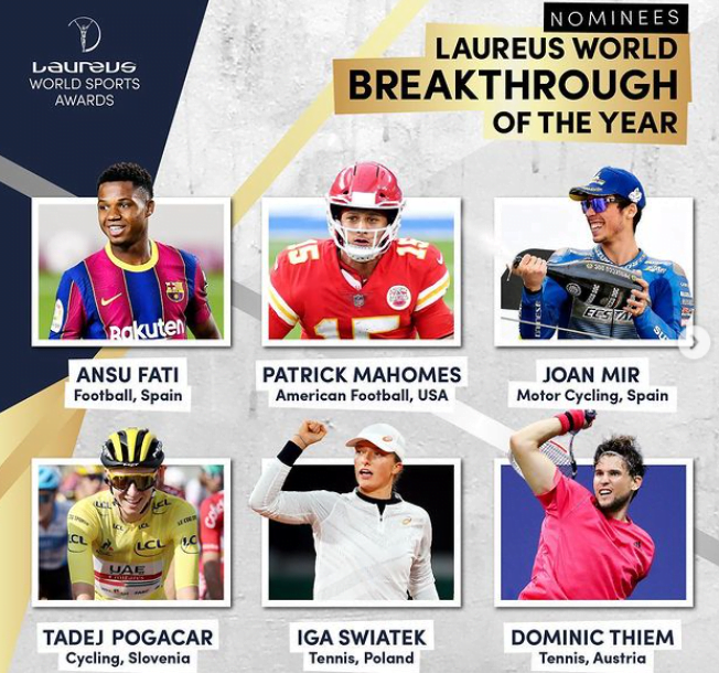 Patrick Mahomes, quart-arrière des Chiefs de Kansas City, qui a remporté le Superbowl l’année dernière, la joueuse de tennis polonaise Iga Swiatek (vainqueur de l’Open de France) et le talent de footballeur Ansu Fati du FC Barcelone sont aussi de la sélection.