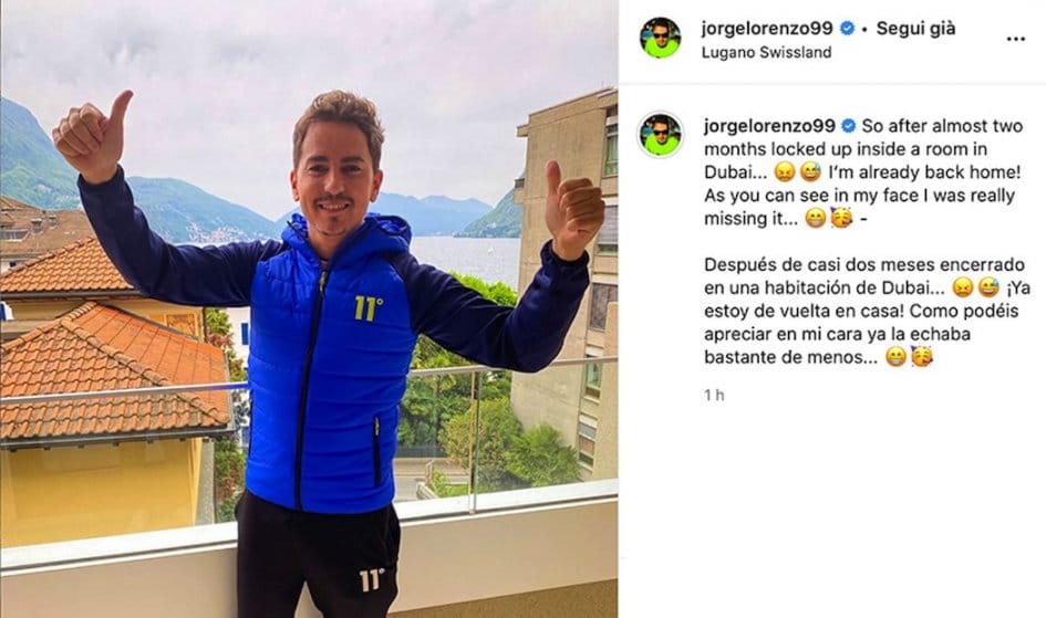 « Après environ deux mois enfermés dans une pièce à Dubaï, je suis enfin de retour chez moi ! Comme vous pouvez le voir sur mon visage, ça me manquait beaucoup… », a écrit le Majorquin sur les réseaux sociaux en publiant une photo souriante de lui. Jorge Lorenzo est décidément plein de ressources…