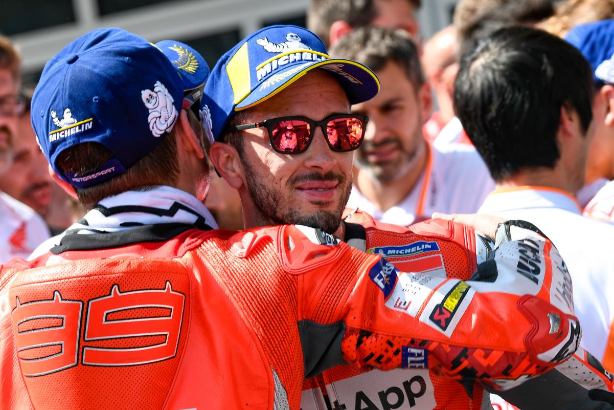 Andrea Dovizioso et Jorge Lorenzo ont été équipiers au sein du team usine Ducati pendant deux ans, et le moins que l’on puisse dire, c’est que l’expérience n’a pas rapproché les deux hommes. Protégé de Gigi Dall’Igna, Por Fuera s’est installé sur la Desmosedici en jouissant d’un salaire dix fois supérieur à celui d’un Dovizioso dans les murs depuis 2013. Lors de la première saison, les relations ont été à peu près cordiales, Jorge Lorenzo assistant au pied du podium à la montée en puissance de son équipier. Mais lors de la seconde, il est clairement apparu qu’ils ne partiraient jamais en vacances ensemble.