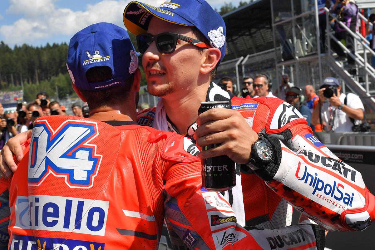 Andrea Dovizioso et Jorge Lorenzo ont été équipiers au sein du team usine Ducati pendant deux ans, et le moins que l’on puisse dire, c’est que l’expérience n’a pas rapproché les deux hommes. Protégé de Gigi Dall’Igna, Por Fuera s’est installé sur la Desmosedici en jouissant d’un salaire dix fois supérieur à celui d’un Dovizioso dans les murs depuis 2013. Lors de la première saison, les relations ont été à peu près cordiales, Jorge Lorenzo assistant au pied du podium à la montée en puissance de son équipier. Mais lors de la seconde, il est clairement apparu qu’ils ne partiraient jamais en vacances ensemble.
