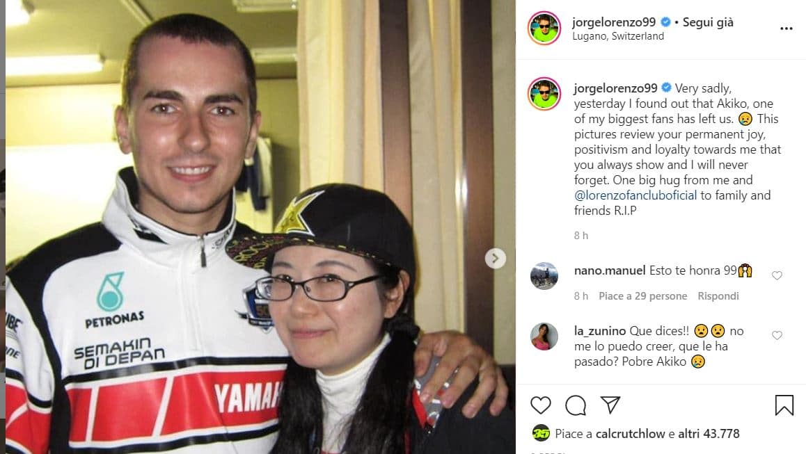 C’est une triste nouvelle pour Jorge Lorenzo, qui a appris la disparition d’un de ses plus fidèles soutiens, qui le suivait sur tous les circuits tout au long de sa carrière. Elle s’appelait Akiko, elle aimait voyager et suivre son idole sur chaque piste, réussissant souvent à prendre des photos avec lui, que Lorenzo a partagées.