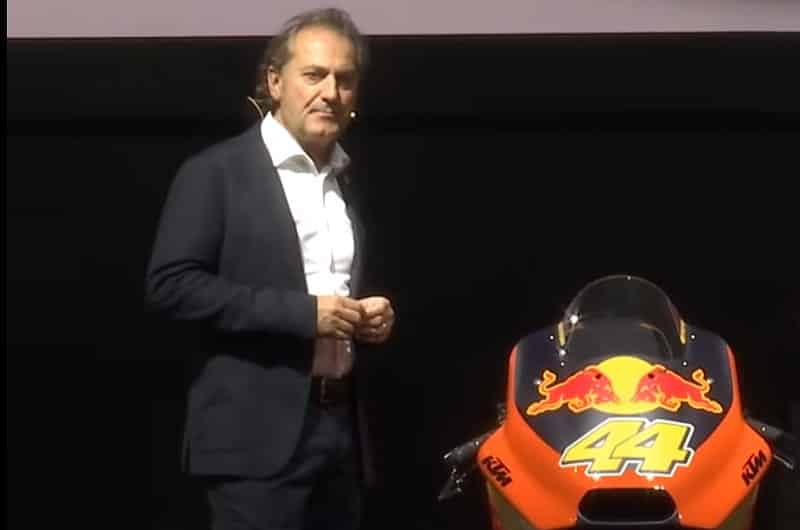 Hubert Trunkenpolz : « Chez KTM, tout a été lié à la compétition et tout est lié à la compétition. Je pense que ce n’est pas un secret que nous avons quelques-uns des plus talentueux techniciens de l’industrie et quelques-uns des meilleurs pilotes, et notre objectif est que nous voulons toujours gagner ! Et nous n’arrêtons pas avant d’avoir atteint ce but ! Cela est indépendant du segment sportif dans lequel nous nous impliquons, et c’est la même chose pour le MotoGP. Donc tôt ou tard, nous voulons gagner là aussi. Bien sûr, cela profite aussi aux clients, et, comme nous l’avons vu plus tôt aujourd’hui, nous courrons, vous gagnez, et c’est pourquoi nous dépensons autant d’argent dans la compétition ».