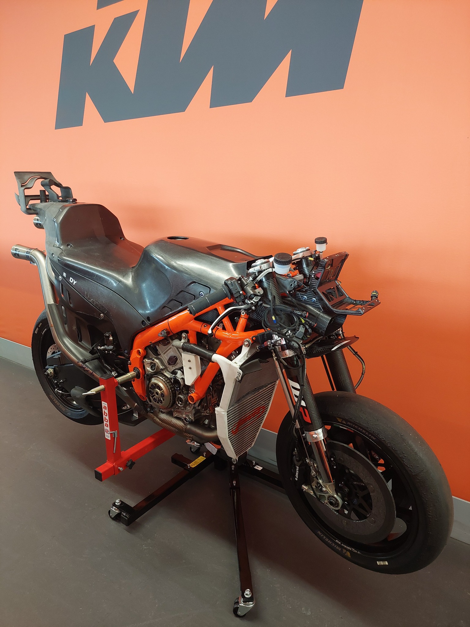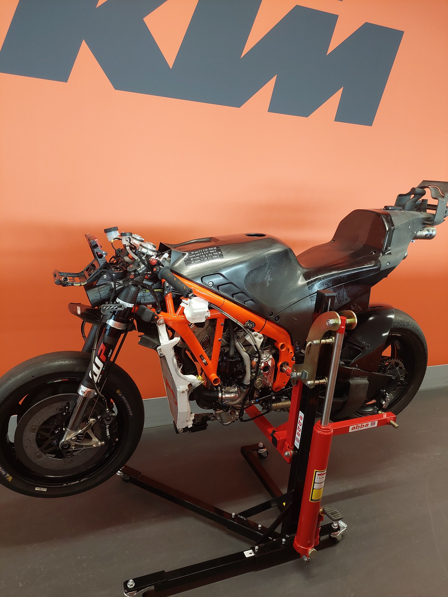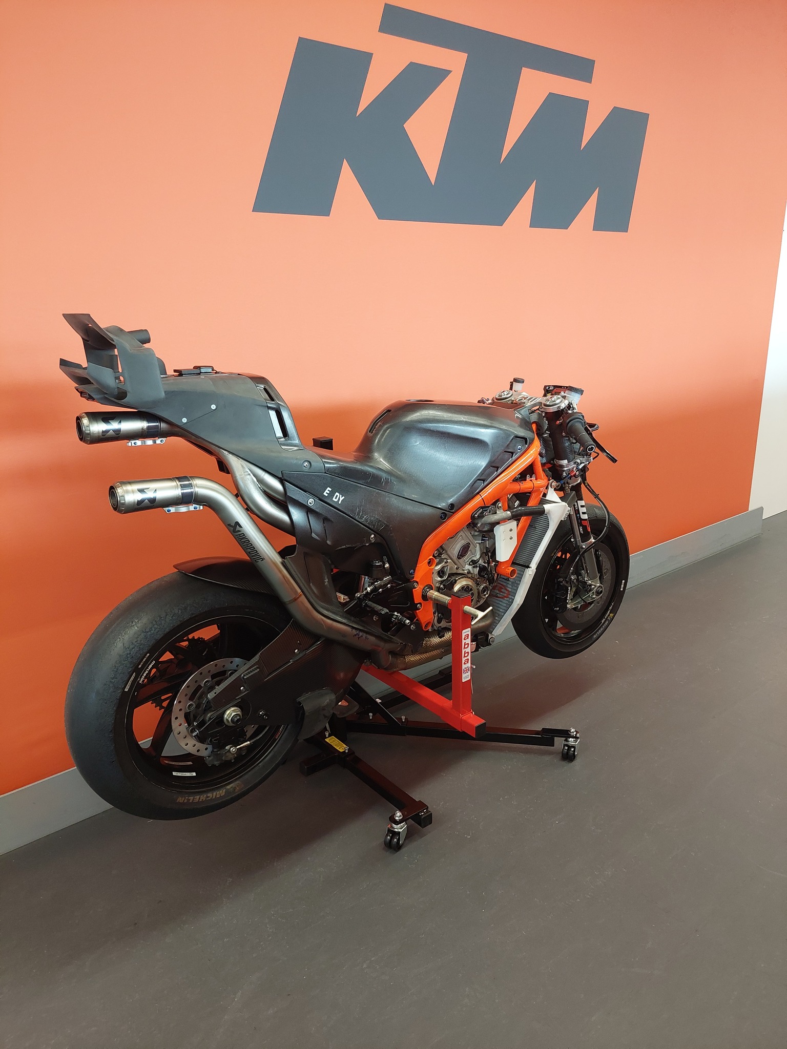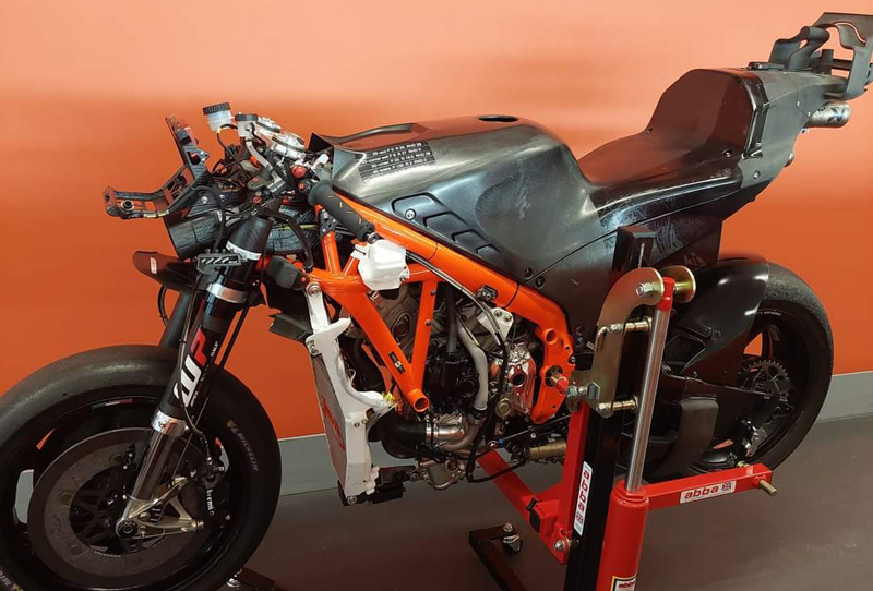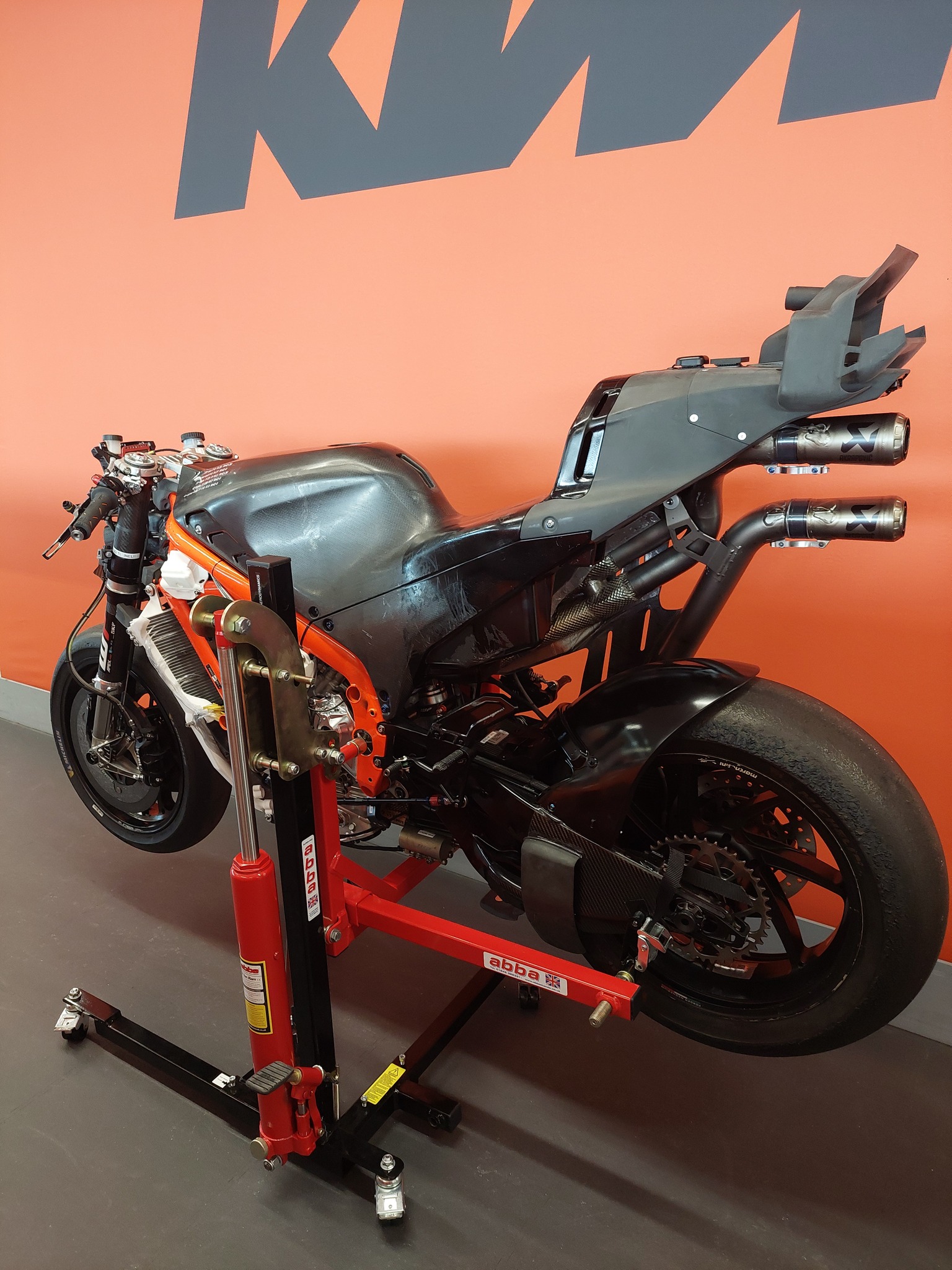 Abba Motorcycle Equipment, un constructeur britannique d’un lève-moto, a été contacté par KTM pour fournir son produit et, pour le remercier, la firme autrichienne lui a fait parvenir quelques photos, photos que l’intéressé a rediffusées sur les réseaux sociaux.