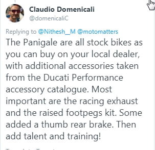 Interrogé pour savoir si les belles italiennes étaient configuration d’origine ou si elles disposaient de pièces de Superbike, le boss de Borgo Panigale a précisé: « Les Panigale sont des motos complètement de série que vous pouvez acheter chez votre concessionnaire local, avec des accessoires supplémentaires tirés du catalogue d’accessoires Ducati Performance. Les plus importants sont l’échappement de course et le kit de repose-pieds surélevés. Certains ont ajouté un frein arrière au pouce. Après, ajoutez du talent et de l’entraînement ! »