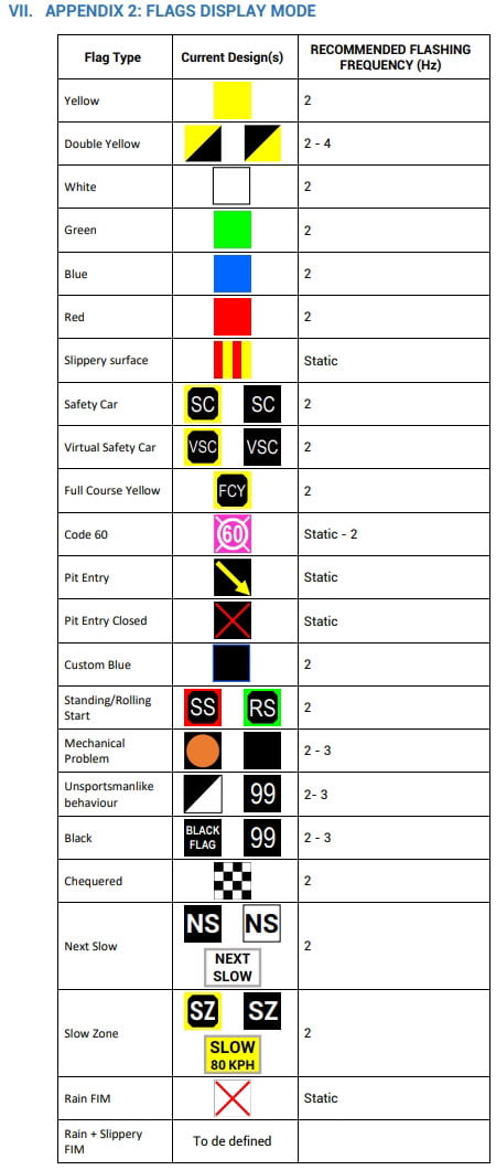 Ces panneaux lumineux peuvent être commandés par la direction de course ou par les commissaires de piste et sont utilisés pour afficher des informations cruciales à destination des pilotes, notamment les informations concernant les couleurs de drapeau, l’état de la piste et si une voiture de sécurité ou une voiture de sécurité virtuelle est entrée en piste.
