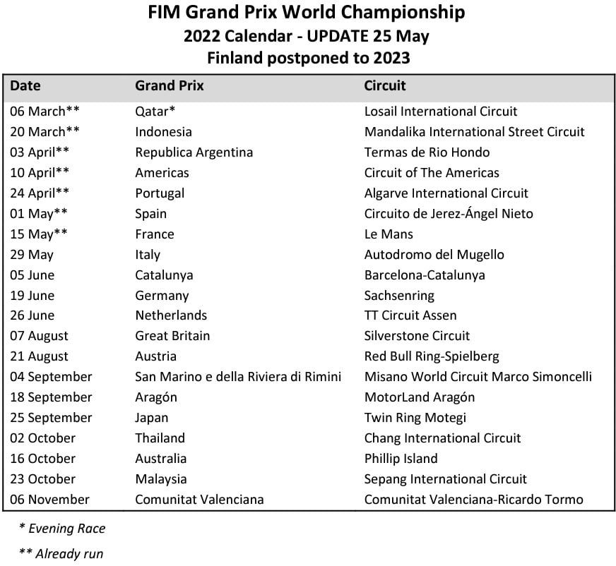 La FIM, l’IRTA et Dorna Sports sont dans l’obligation d’annoncer des changements au calendrier du Championnat du Monde FIM MotoGP™ 2022.