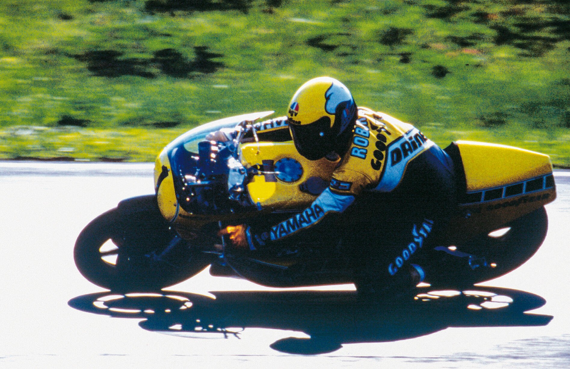Mais en 1978, un martien a débarqué en GP moto, avec un passeport californien et portant le nom de Kenny Roberts. Il est apparu avec un tout nouveau style de pilotage qui allait révolutionner rapidement la conception des combinaisons de cuir. Il penchait plus que quiconque et a ressenti le besoin d’un troisième point de contact avec la piste. C’était la première fois que quelqu’un prenait l’habitude de passer en courbe avec le genou posé au sol. Il a tout de suite établi une nouvelle mode. Tout le monde a compris que ce style était également efficace et a commencé à copier le King Kenny et sa moto noire et jaune.