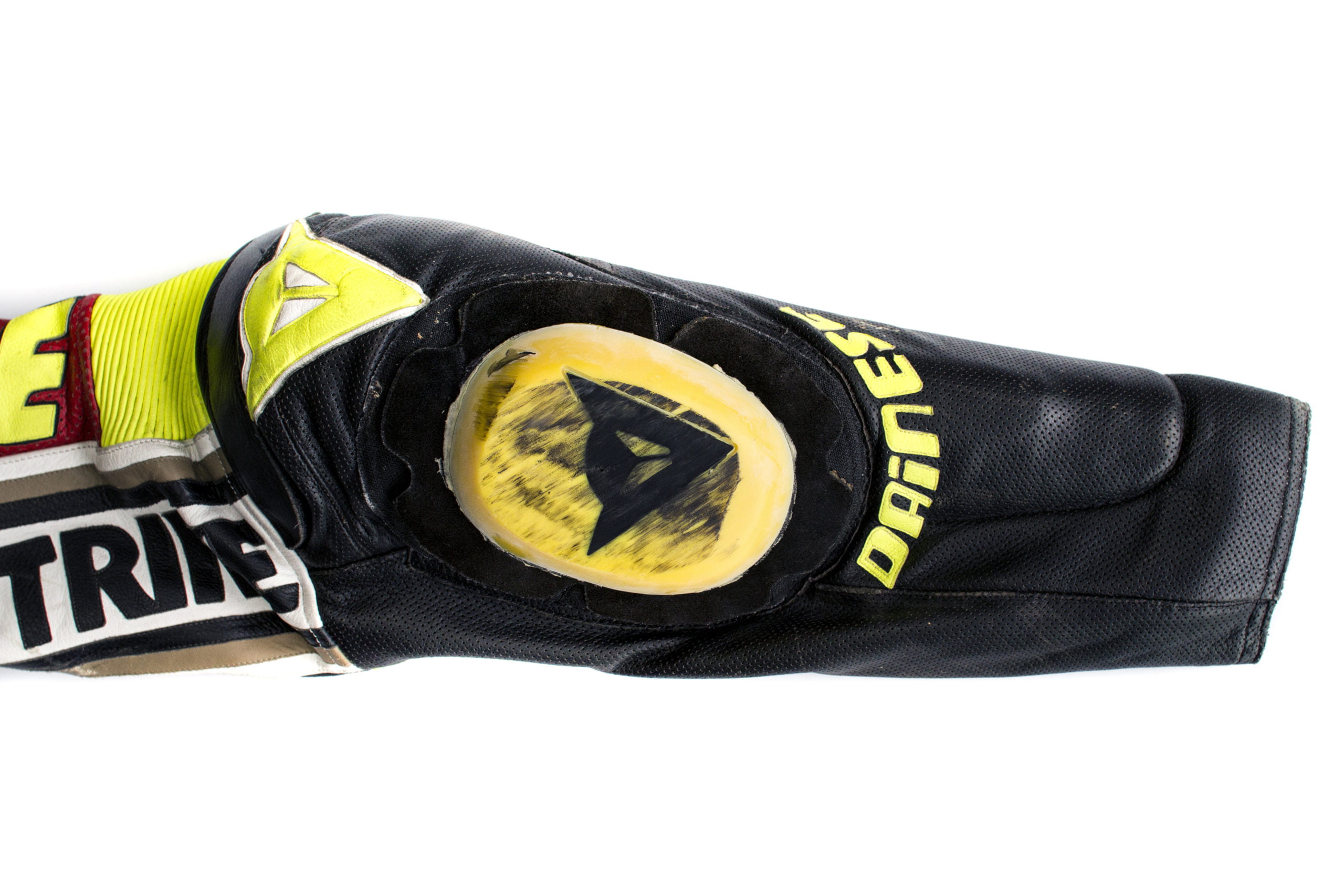Les fabricants de combinaisons sont rapidement intervenus pour aider les pilotes, afin qu’ils puissent offrir les meilleures performances possibles et expérimenter le nouveau style de pilotage. C’est comme cela que le premier slider de genou rudimentaire a été créé. Il a été soumis à évolution et à raffinement au cours de la décennie suivante jusqu’à ce qu’il prenne sa forme actuelle. Dainese a introduit le porc-épic en 1981, du nom de sa forme caractéristique. Il consistait en une série de cylindres en plastique qui émergent de la base lorsque le genou du coureur se plie. Cependant, cela s’est révélé peu pratique. Il n’était pas facile de le remplacer lors de son utilisation. Il reste très peu d’exemples de combinaisons avec sliders de ce type. Un exemplaire remarquable a appartenu au quintuple champion du monde Toni Mang et est maintenant conservé au Dainese Archivio à Vicence.