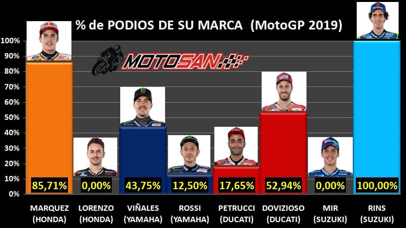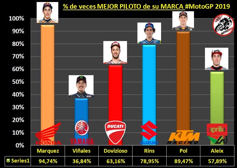 Au-delà des podiums, nous verrons à quel point le meilleur pilote de chaque marque est arrivé devant ses rivaux avec la même moto. Marc Márquez, le numéro un incontesté de Honda, a été le meilleur dans 18 des 19 courses auxquelles il a participé, à l’exception de sa chute à Austin où Nakagami a été le meilleur pilote de la marque japonaise. À l’heure actuelle, Dovizioso est aussi clairement le meilleur de sa marque, étant le meilleur Ducatiste dans 12 des 19 courses, avec Petrucci à 4 reprises et Miller à 3 autres.