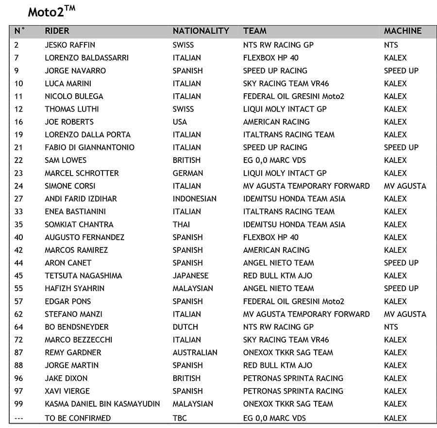 Ainsi, chez Avintia Ducati, on en est toujours à Tito Rabat et Karel Abraham. Cependant, en Moto2, le guidon de la Kalex abandonnée par le frère de qui vous savez est à prendre…