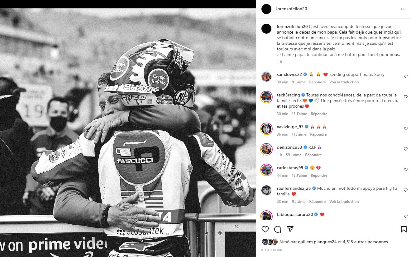 lorenzofellon20 : « C’est avec beaucoup de tristesse que je vous annonce le décès de mon papa. Cela fait déjà quelques mois qu’il se battait contre un cancer. Je n’ai pas les mots pour transmettre la tristesse que je ressens en ce moment mais je sais qu’il est toujours avec moi dans la paix.