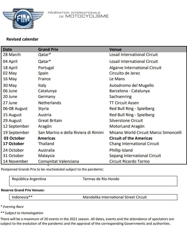 La FIM, l’IRTA et Dorna Sports sont en mesure d’annoncer une nouvelle date pour le Grand Prix Red Bull des Amériques à Austin, au Texas. L’événement avait été précédemment reporté et se déroulera désormais du 1er au 3 octobre 2021.