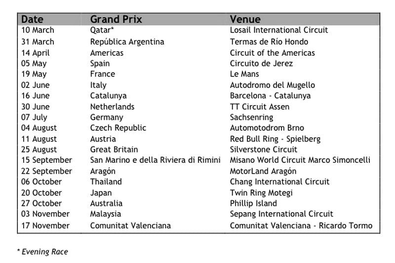 Pas de grande surprise à la vue du nouveau calendrier de l’an prochain puisque nous y retrouverons les mêmes dix-neuf courses que cette année. La saison commencera en effet, comme d’habitude, par le Qatar, début mars. Les pilotes auront ensuite trois semaines de pause avant de s’envoler pour l’autre partie du globe : le Grand Prix d’Argentine tout d’abord, puis celui des Amériques ensuite.