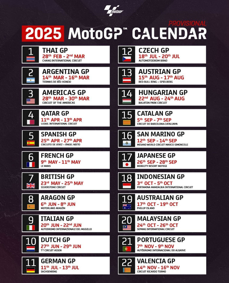 Save the dates as #MotoGP buckles up for 22 races next year! 🏁💥#MotoGP2025 pic.twitter.com/LLdO88Q6bo