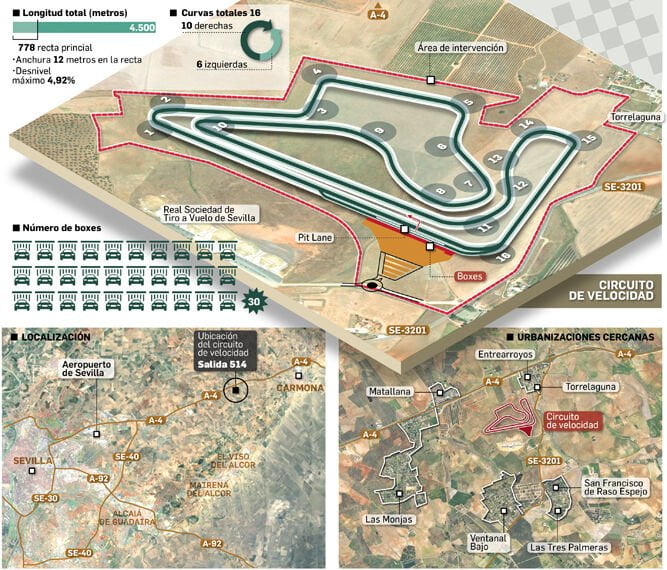 Soucieuse de se développer, la famille García a déjà investi 4 millions d’euros pour acheter les 56 hectares de terrain à proximité de la ville de Carmona, situé à une vingtaine de kilomètres de Séville. Après quatre années de travail et de négociations, le feu vert est donc donné au projet d’un tracé de 4,5 kilomètres qui comprendrait dix virages à droite et six à gauche d’une piste de 12 mètres de large, avec une « petite » ligne droite de seulement 778 mètres. Une trentaine de box sont prévus pour travailler dans de bonne conditions.