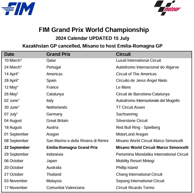 Calendrier MotoGP 2024 mis à jour au 15 juillet :
