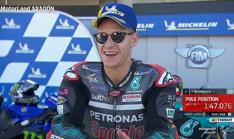 A peine descendu de sa Yamaha YZR-M1 satellite du team Petronas Yamaha SRT après avoir obtenu sa 10e pole position en MotoGP sur la grille de départ du Grand Prix d’Aragón, Fabio Quartararo s’est confié devant la caméra du site MotoGP.com avec la joie d’avoir brillamment sauvé la situation après sa spectaculaire chute matinale…