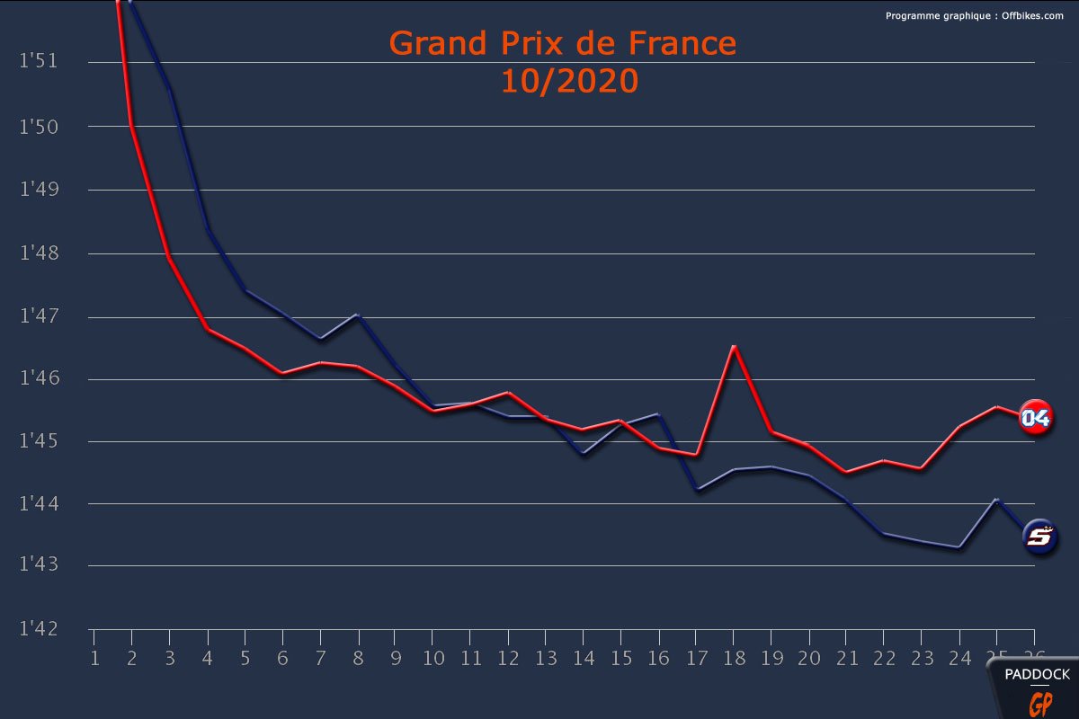 Et pourtant, ô combien ont été différentes leurs courses et leurs déclarations ! Alors, avant de répondre à la question de savoir si Johann Zarco aurait pu terminer devant Andrea Dovizioso si la course s’était déroulée sur les 27 tours initialement prévus, les courbes vont nous permettre de dégager quelques faits intéressants.