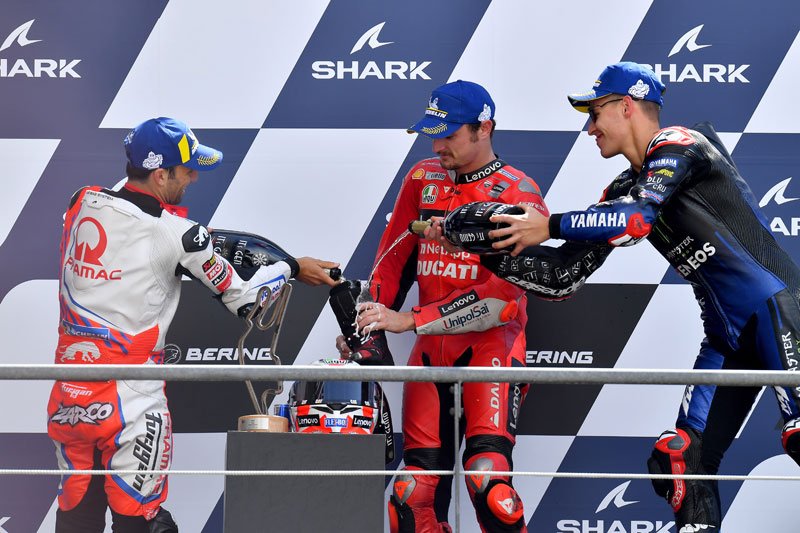 « Il est trop tôt pour le dire. Je pense qu’avec les bonnes relations que nous avons tous ensemble, Pecco, Jack et moi, si quelqu’un a vraiment une chance et qu’un autre pilote Ducati se bat avec Fabio, peut-être qu’on peut y penser. Mais ce genre de pensées arriveront seulement lors des deux dernières courses, maximum, car à partir de maintenant beaucoup de choses peuvent se produire. Pour le moment je pense qu’il est mieux de voir le jeu avec trois Ducati devant : Si nous pouvons gérer de cette façon, ce sera encore mieux. »